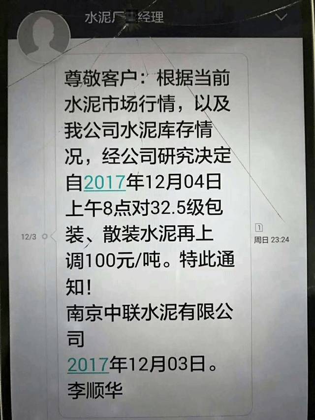 此前,南京中联水泥有限公司发通知给下游客户称,根据当前水泥市场行情,以及公司库存情况,经公司研究决定自12月4日上午8点起对32.5级包装、散装水泥上调100元/吨。上调后执行的价格是32.5袋装水泥620元/吨。