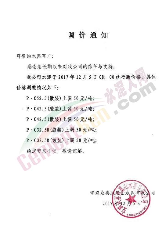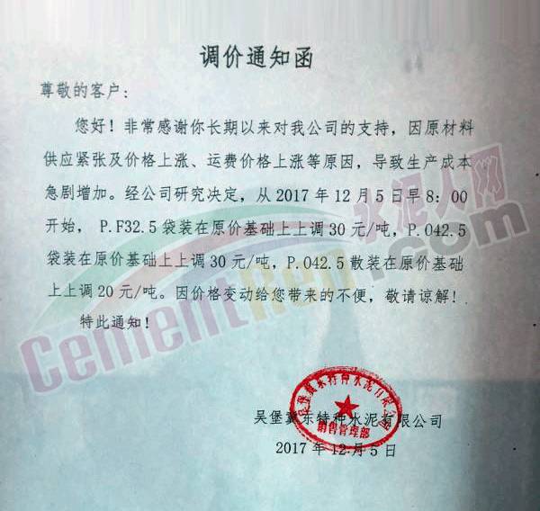 因原材料供应紧张及价格上涨、运费价格上涨等原因,导致生产成本急剧增加。经公司研究决定,从2017年12月5日早8点开始,P.F32.5袋装水泥在原价基础上上调30元/吨,P.O42.5袋装在原价基础上上调30元/吨。P.O42.5散装在原价基础上上调20元/吨。