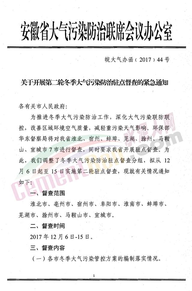 【水泥人网】日前,安徽省大气污染防治联席会议办公室发布《关于开展第二轮冬季大气污染防治驻点督查的紧急通知》通知称:为推进冬季大气污染防治工作,深化大气污染联防联控,改善区域环境空气质量,减轻重污染天气影响。环保部华东督察局将对安徽省淮北、宿州、蚌埠、芜湖、滁州、马鞍山、宣城市7市进行督查,同时要求安徽省开展驻点督查,为此安徽省调整了冬季大气污染防治驻点督查分组,拟从12月6日起至15日实施第二轮驻点督查。