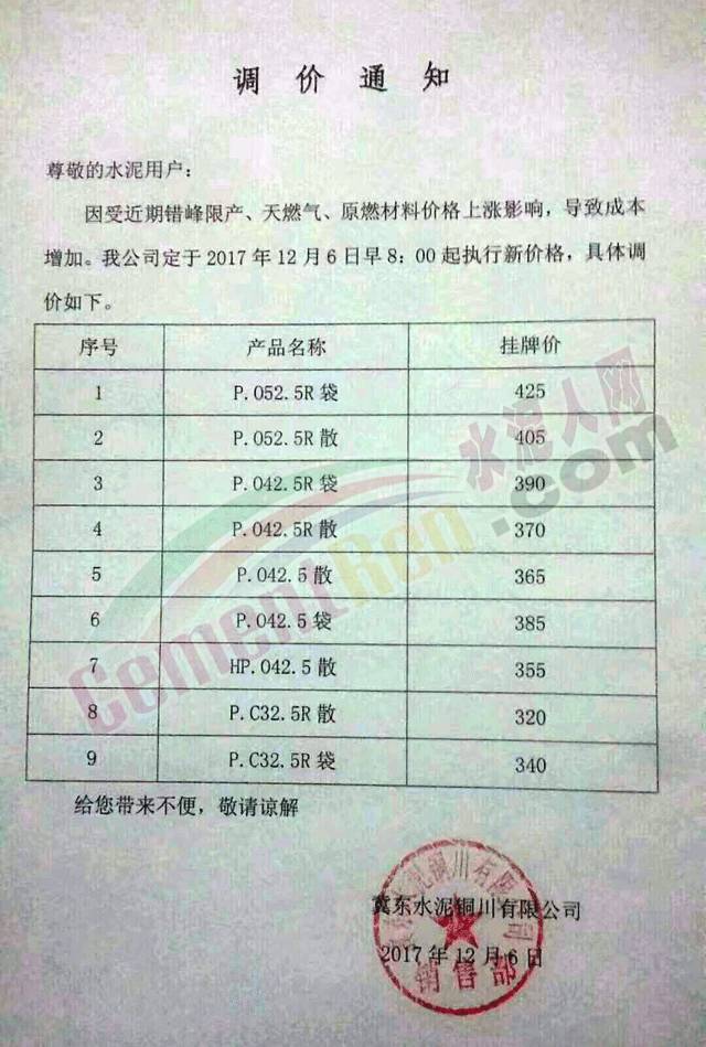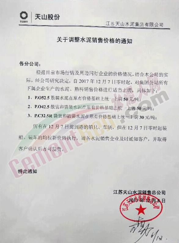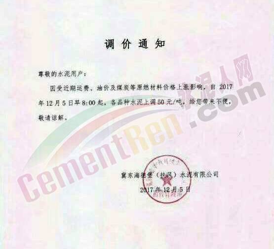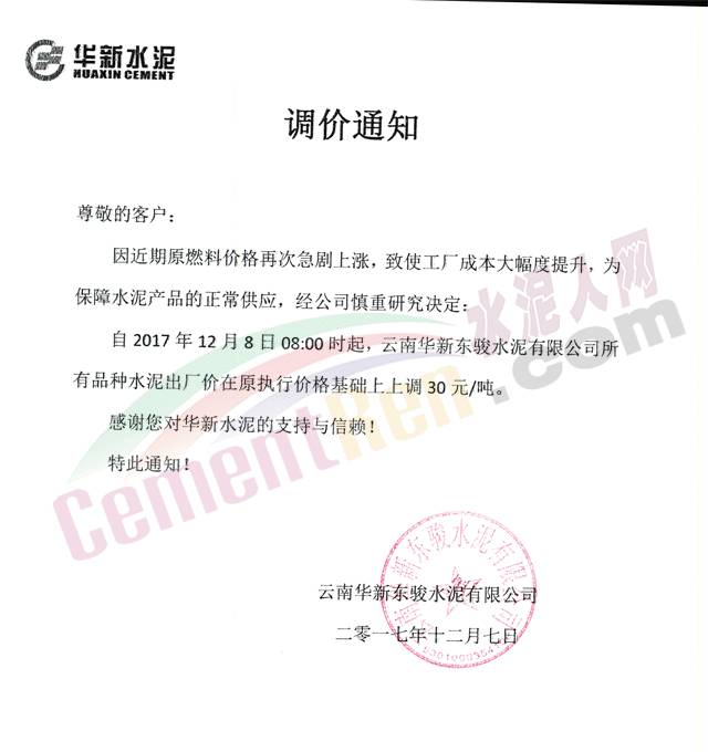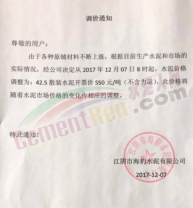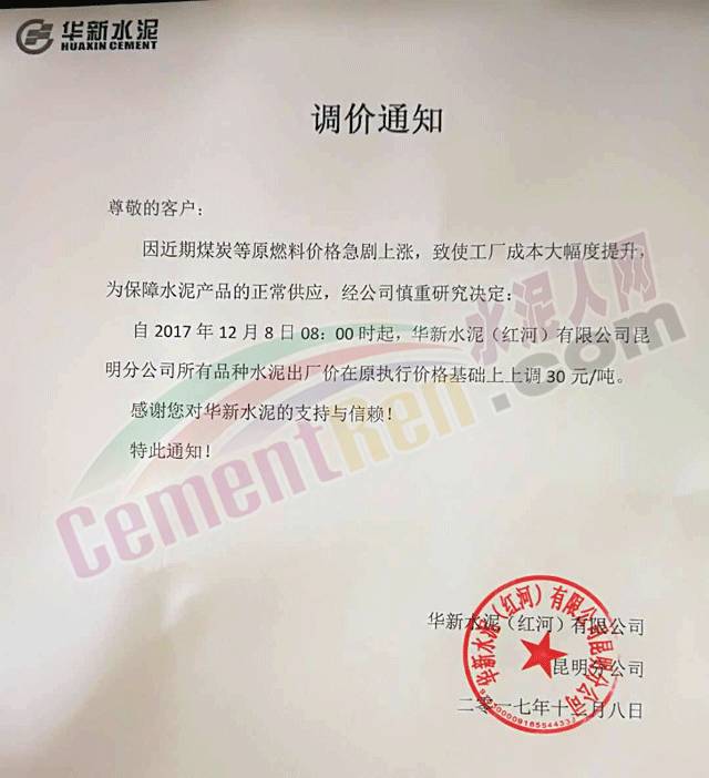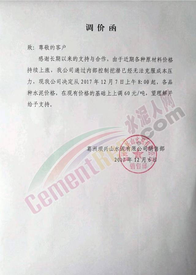 【水泥人网】近期多家企业发布提价通知,今日也不例外,云南、陕西、山西、江苏、湖北等多区域企业发布提价通知,通知函如下: 云南华新东骏水泥有限公司 华新水泥(红河)有限公司 冀东海德堡(扶风)水泥有限公司 冀东水泥铜川有限公司 山西吉港水泥有限公司 江苏天山水泥销售总公司 江阴市海豹水泥有限公司 葛洲坝兴山水泥有限公司