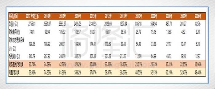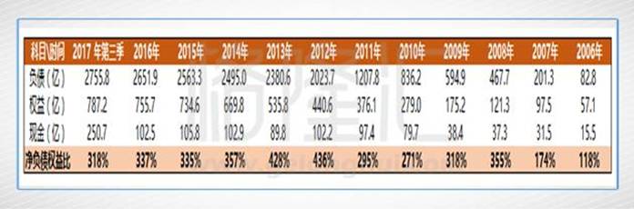 从上图来看,资产负债率近年来一直在下降,绝对值虽高但却感受不到异常,2017年第三季这数据更下降到77.78%。十年前,这一数字还停留在118%,十年后则完全超过320%,提升幅度超过2倍,鬼知道它经历了什么。最高峰还去到不可思议的430%以上,还连续保持了两个会计年度,这种“神技”也许只有央企才能做得出来。