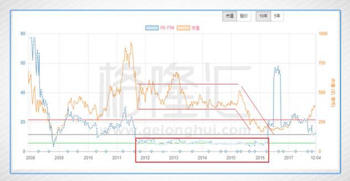 在2011年末至2014年末,中国建材的平均市盈率保持在4-5倍之间,表明上看起来很便宜,实际上是一个“价值陷阱”。2015年期间在这样的估值基础下,中国建材下跌幅度竟超过65%,究其原因,2015年及2016年的净利润不足30亿,对比2012年-2014年年度平均净利润跌幅超2/3,再往深挖,造成净利润大跌50-60亿级别主要原因在于毛利率的下跌,而财务费用、管理费用等巨额固定支出依然不减,致使上述两费占毛利比由2014年的59.82%大幅上升至2015年的81.36%及2016年的74.25%。