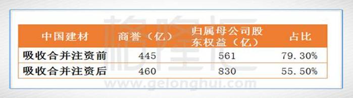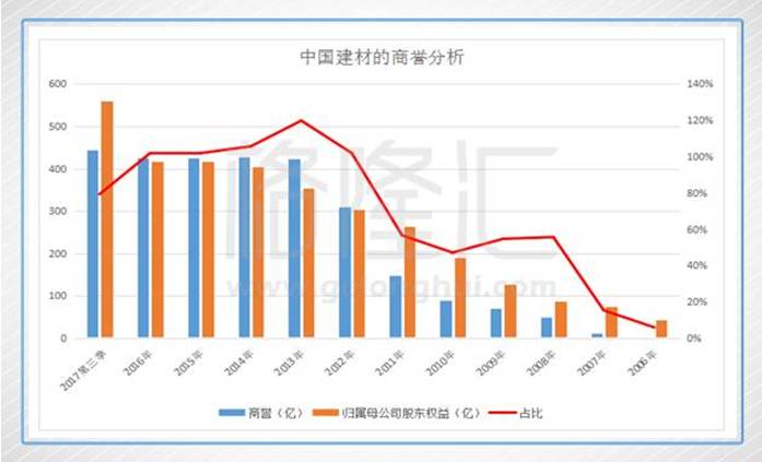 二、中国建材引人注目的地方除了高额的利息支出及固定支出外,其庞大的商誉的存在一直被市场人士咎病。2008-2011年商誉所占归属母公司公司权益超过50%,比2007-2006年度上了何止一个台阶。2012-2016年年度这个数据又比2008-2011年度再翻了一番,达到惊人的100%以上(峰值为2013年的119.83%),换言之,合并报表的商誉的数额一项完全超过了归属母公司股东权益的数值。如今最新一期报表显示的商誉为445亿,假若未来若碰上符合商誉减值测试的事件,每变动5%,则相关减值影响超过22亿,而2016年年末的净利润数据仅为28亿左右。(单从会计口径角度思考)中国建材背着如此庞大的商誉资产彷如背着“定时炸弹”。