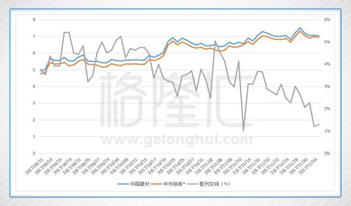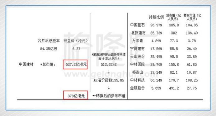 吸收合并中材股份后的中国建材的总股本为84.35亿股,按照12月6日最新的收盘价6.37港元可知其重组后的总市值为537.3亿港元,而其参股控股的主要A股上市公司合计持股市值为513.3亿港元,若按照最新的AH溢价指数来“转换”这部分市值来参考可得到378亿港元,两者的差额为135.3亿港元。