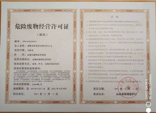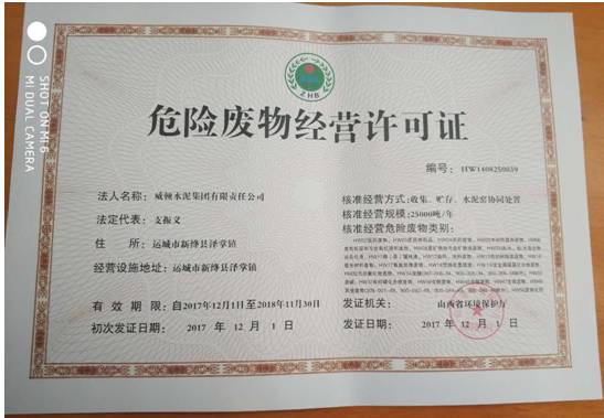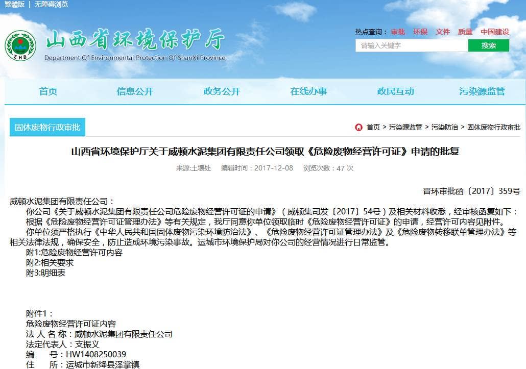 12月8日山西省环保厅在其官网上公开公布了关于威顿水泥集团有限责任公司领取《危险废物经营许可证》申请的批复。