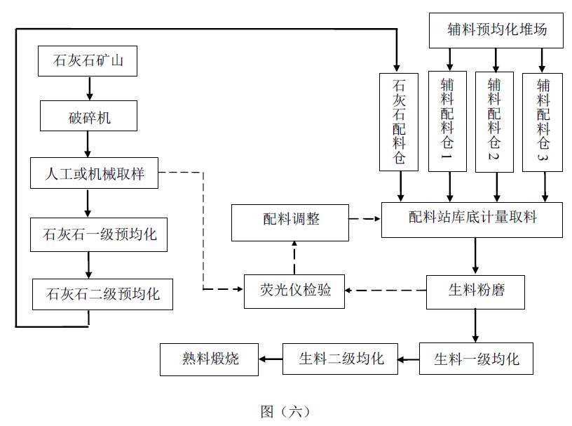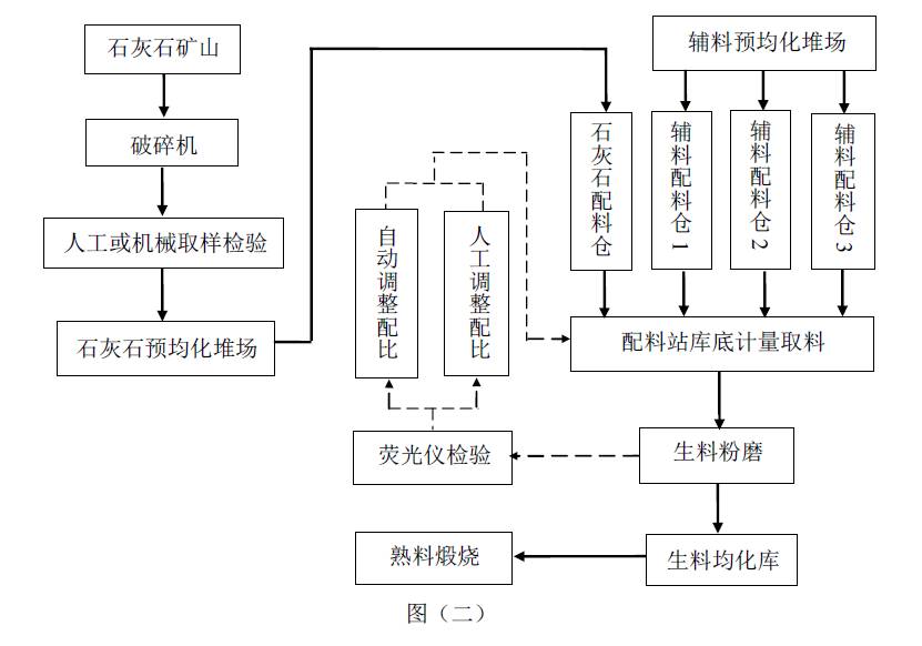 “图二”是目前比较通用的水泥生料质量控制图,矿山石灰石进厂经破碎后,通过人工或机械取样检验,进入石灰石预均化堆场,经取料机取料后进入石灰石配料仓,配料站库底计量取料后进行生料粉磨,出磨生料经过连续取样、荧光仪检验后进入生料均化库,最后进行熟料煅烧,原料配比调整有自动调整和人工调整两种方式。