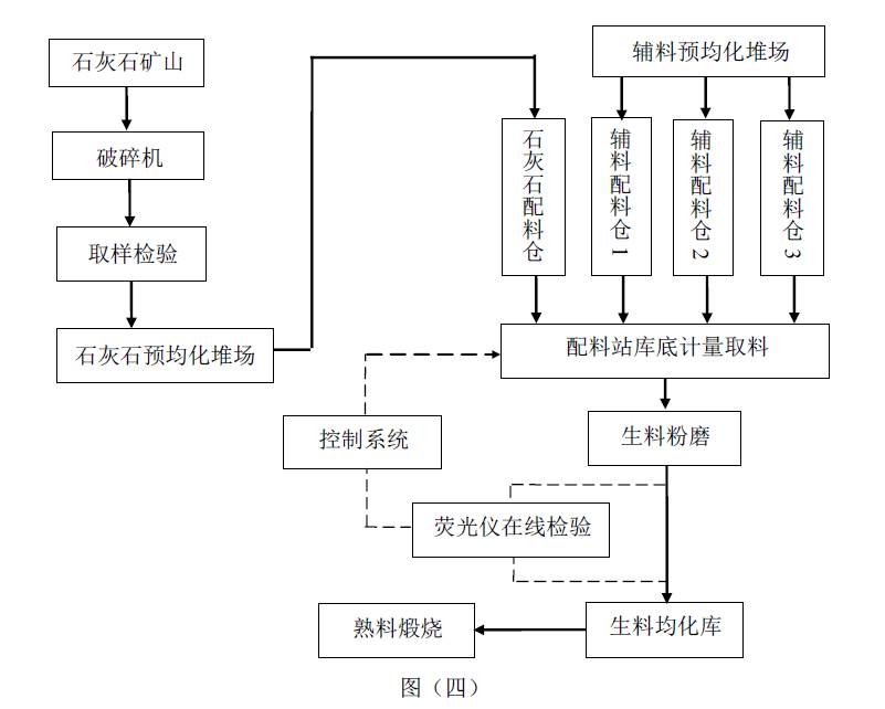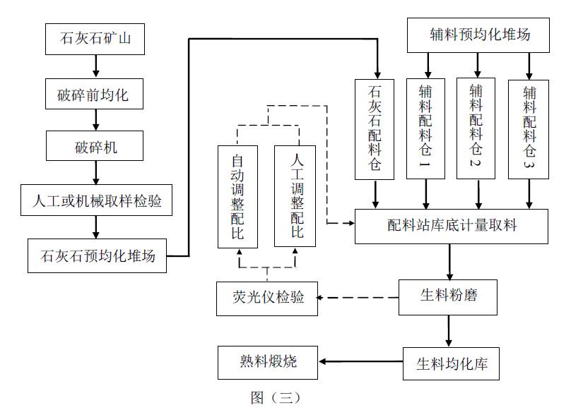(3)由于根据石灰石成分的变化情况实施原料配比的事先调整,实行先检后用的控制策略,前期的石灰石预均化工序已经没有必要,用不同石灰石立库代替,只要满足配料要求即可。