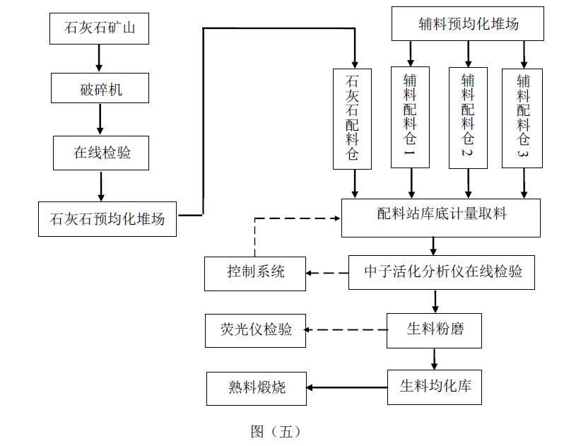 “图五”是目前比较先进的水泥生料质量控制图,在好多大企业得到应用,进厂石灰石经破碎后在传送带上用中子活化分析仪进行在线检验,经均化后进入配料站。在配料站的库底进行计量取料,用中子活化分析仪对传送带上的所有入磨混合物料进行在线检验,一分钟提供一次检验数据,同时配备的控制系统一分钟自动调整一次原料配比,出磨生料同样需要荧光仪检验,防止失控。