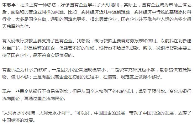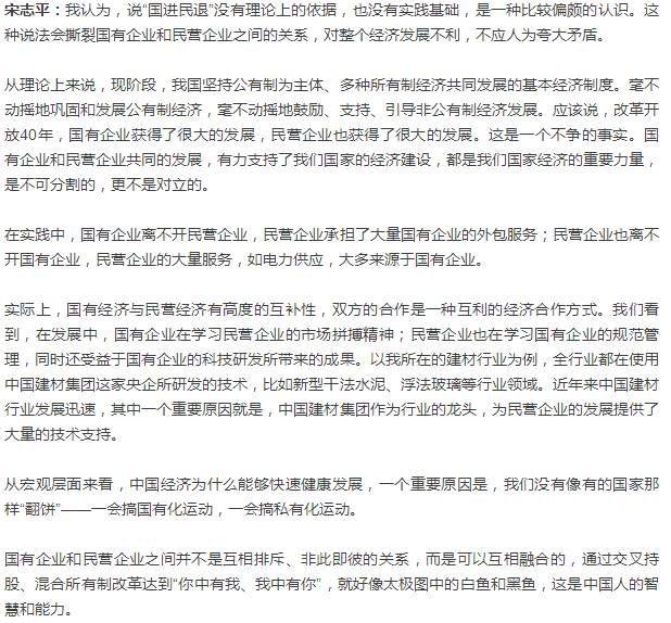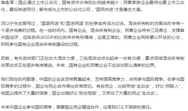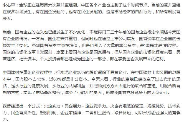 【水泥人网】“近几年来,无论是学术界还是社会上,时而有人提‘国进民退’。近来,又有这样的说法传出,但实际数据表明,民企发展得很快,民营经济占国民经济的比重已经超过60%。通过混合所有制改革,国企和民企也已经是你中有我、我中有你的状态。”近日,中国建材集团有限公司董事长、党委书记宋志平接受记者专访时表示,“国进民退”的说法没有依据,“国民共进”才是事实。