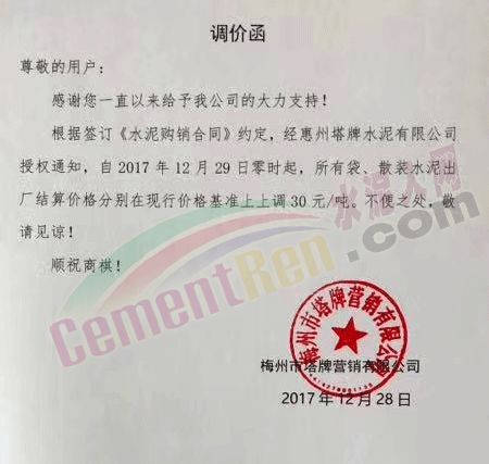【水泥人网】昨日,梅州市塔牌营销有限公司发布提价通知称:根据签订《水泥购销合同》约定,经惠州塔牌水泥有限公司授权通知,自今日(29日)零时起,所有袋、散装水泥出厂结算价格分别在现行价格基准上上调30元/吨。