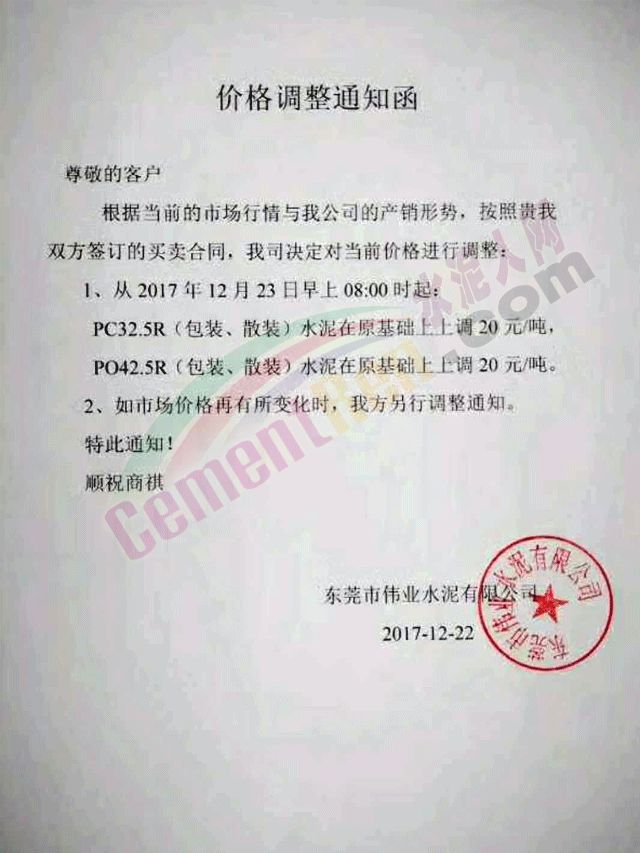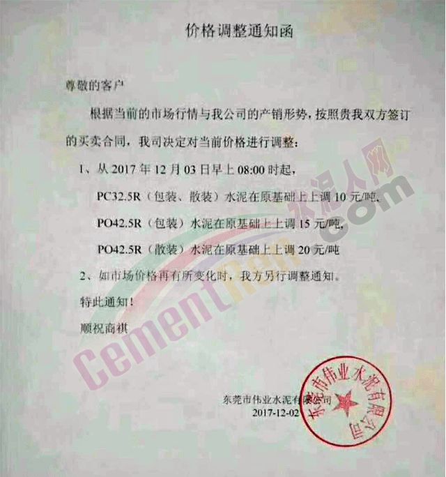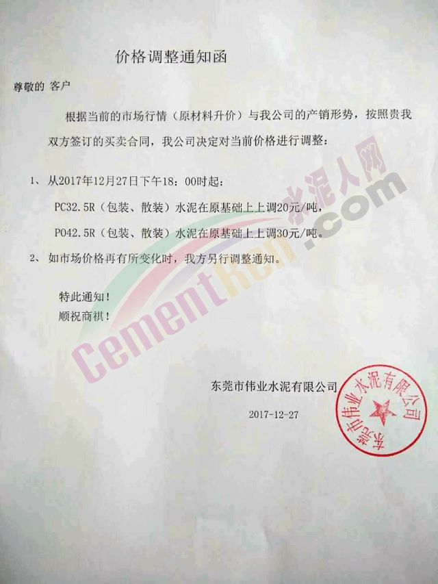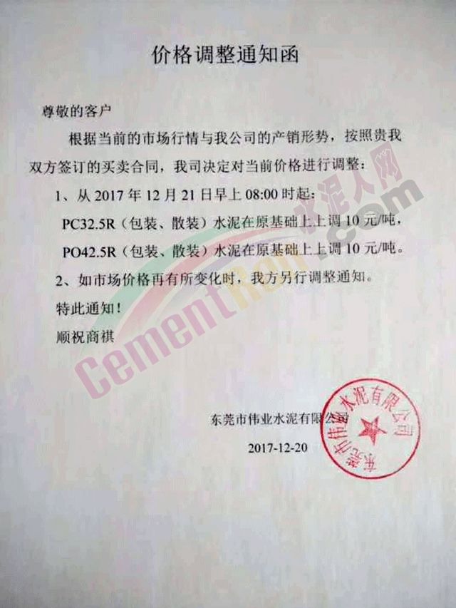 据水泥人网了解,广东东莞市伟业水泥有限公司近七天内三次上调水泥价格。其中PC32.5R袋装、散装水泥七天共涨价50元/吨;PO42.5袋装、散装水泥七天共涨60元/吨。