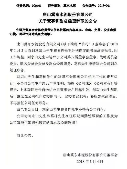 【水泥人网】日前,冀东水泥发布关于董事和副总经理辞职的公告。公告称,董事会于 2018年 1 月 3 日收到刘宗山先生和葛栋先生分别提交的书面辞职报告。因工作调整,刘宗山先生申请辞去公司第八届董事会董事、战略委员会委员、提名委员会委员及副总经理职务,葛栋先生申请辞去公司副总经理职务。