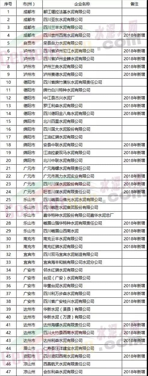2018年四川省拟纳入电力直接交易用户水泥企业名单