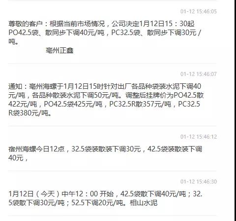 随着海螺元月11日在华东地区熟料的降价,12日皖北地区的水泥价格也应声而降。主导企业发布通知称根据市场情况自12日下午三点起各企业水泥价格下调50-20元/吨。