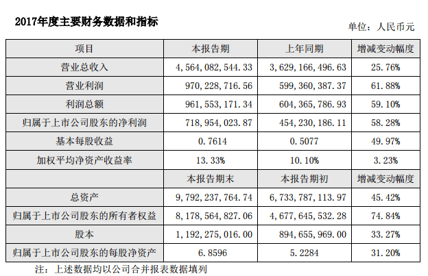 2017年,公司水泥销售价格较上年同期上升了21.59%,因材料价格上涨导致水泥销售成本同比上升了15.58%,水泥销售价格的上涨高于成本的上升使得综合毛利率提高了3.42个百分点。报告期内公司营业利润、利润总额和归属于上市公司股东的净利润实现了较大幅度的增长,并使得报告期内加权平均净资产收益率同比上升了3.23个百分点。