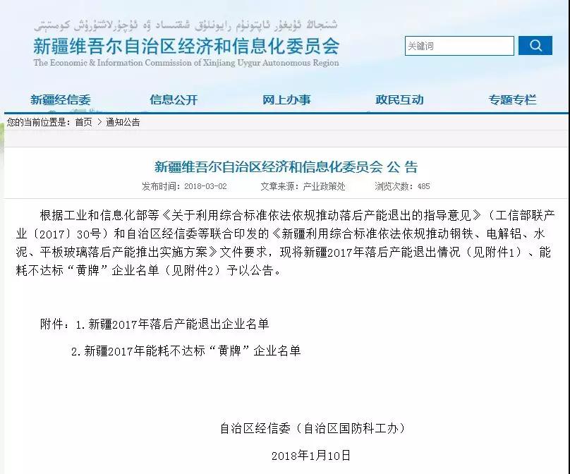 【水泥人网】日前,新疆维吾尔自治区经济和信息化委员会发布公告,公告称根据工业和信息化部等《关于利用综合标准依法依规推动落后产能退出的指导意见》(工信部联产业〔2017〕30号)和自治区经信委等联合印发的《新疆利用综合标准依法依规推动钢铁、电解铝、水泥、平板玻璃落后产能推出实施方案》文件要求,将新疆2017年落后产能退出情况、能耗不达标“黄牌”企业名单予以公告。