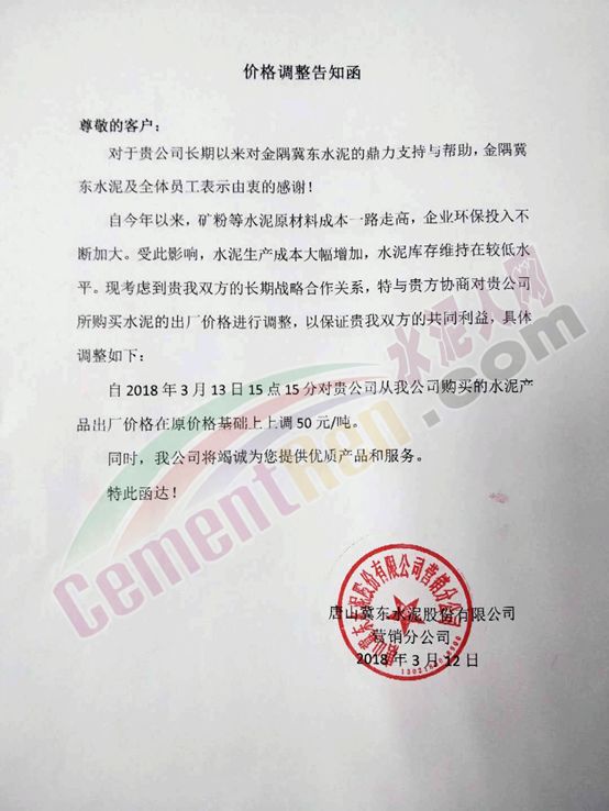 唐山冀东水泥价格调整通知