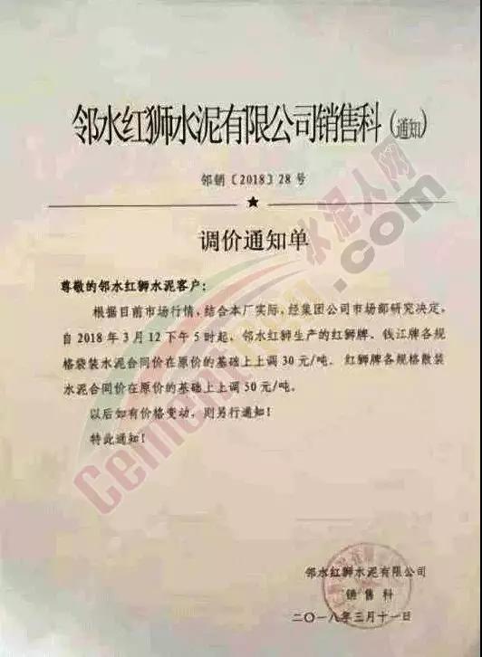 川东区域主导企业邻水红狮水泥调价通知称:根据目前市场行情,结合本厂实际,经集团公司市场部研究决定,自3月12日下午5时起,上调红狮牌、钱江牌各规格袋装水泥合同价在原价的基础上上调30元/吨,红狮牌各规格散装水泥合同价在原价基础上上调50元/吨。通知文原文如下
