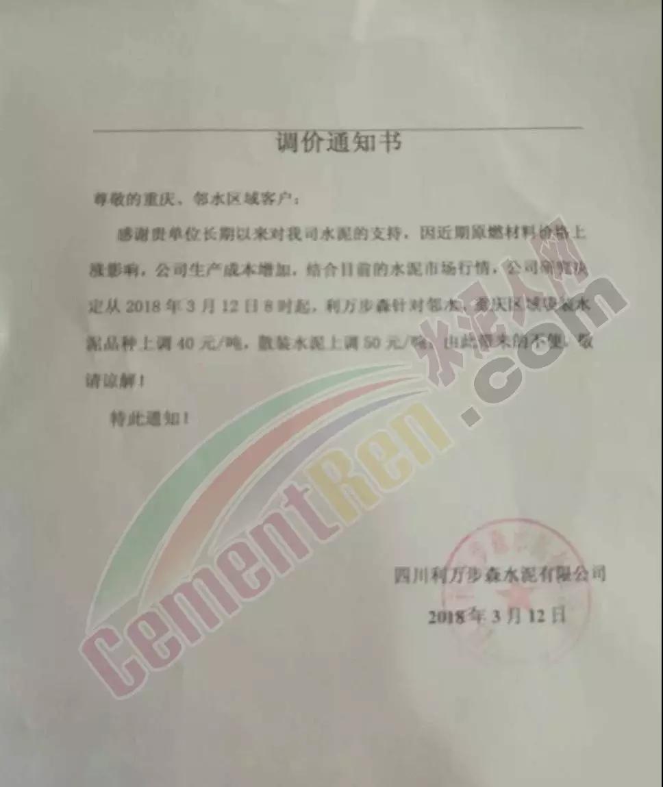 另据水泥人网重庆通讯员消息,自昨日(12日)起,重庆主城区企业陆续发布通知上调水泥出厂价,上调幅度也在30-50元/吨。