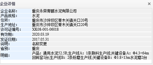 质检总局信息中心数据显示,重庆永荣青鹏水泥有限公司位于重庆市沙坪坝区青木关镇关口20号 。