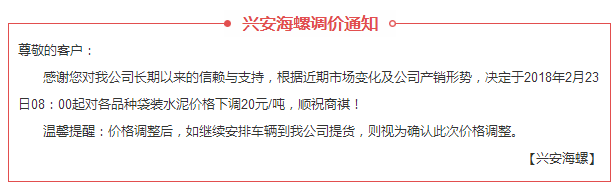 据了解广西兴安海螺曾在2月下旬发布降价通知,通知袋装水泥下调20元/吨。