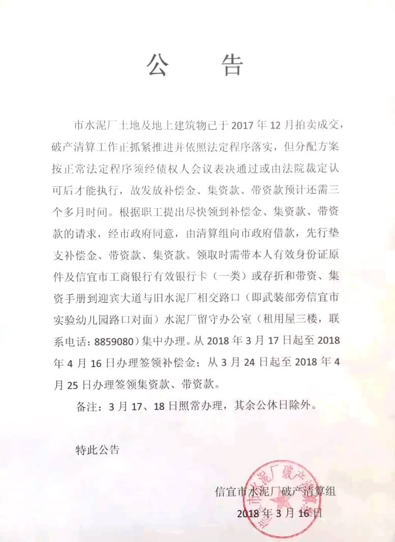 信宜市委、市政府对水泥厂的破产清算工作十分重视,多次召开会议研究落实做好水泥厂破产清算工作,信宜市政府、信宜市科工商务局及水泥厂破产清算组已三次召开约访职工代表会议。