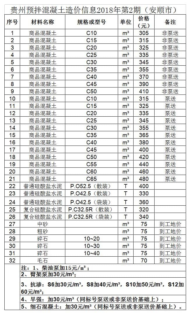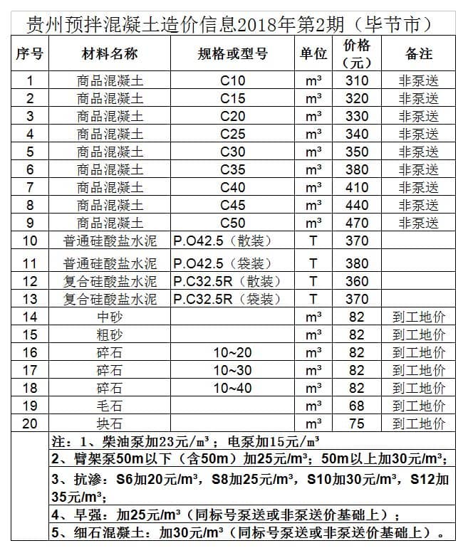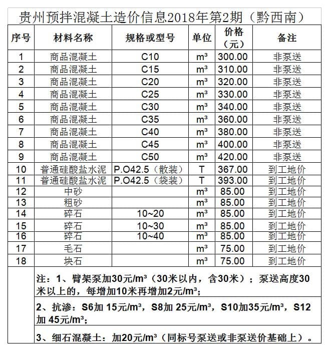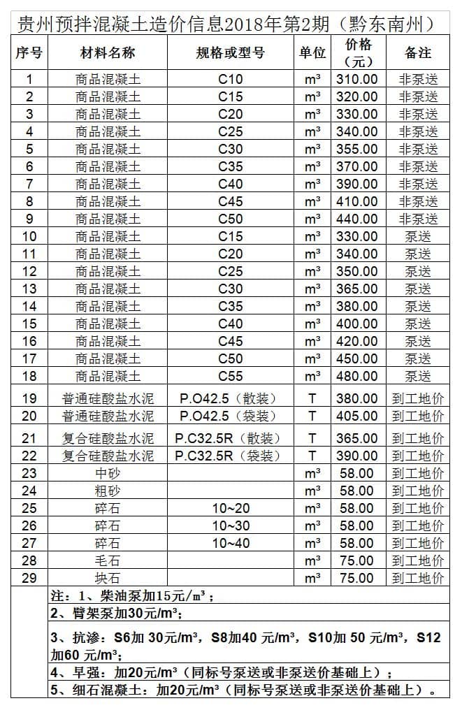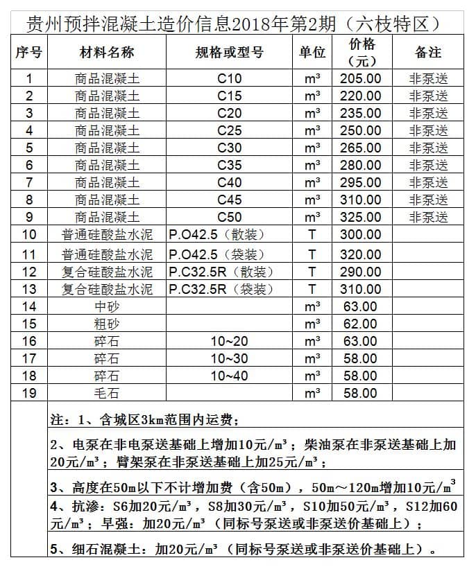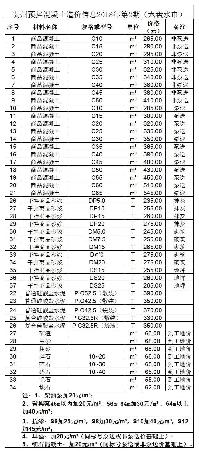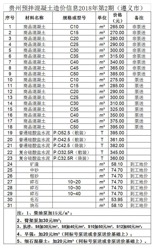 造价 | 贵州省预拌混凝土造价信息2018年第2期