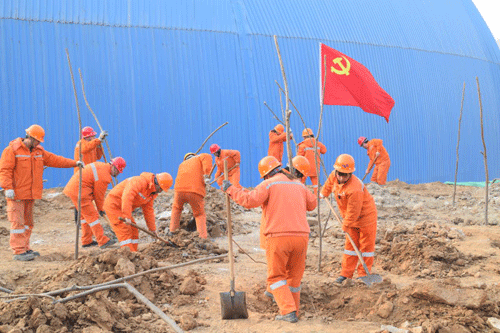 植树地点位于公司三线石灰石堆场北侧的山坡上,活动现场,党员团员充分发挥模范带头作用,大家在领取了树苗和工具后,紧张有序的开始劳动,植树现场,立刻呈现出一派繁忙的劳动景象。参加植树的职工个个热情洋溢、干劲十足,有的拿铁锹,有的扶树苗,你追我赶,比干劲、比进度,各个环节衔接有序,样样做得认真到位,个个忙得满头大汗。到处都是忙碌的身影和劳动的欢声笑语……大家干劲十足地完成了从挖坑、放树、填土、踩实到最后浇水的每一个步骤。热火朝天的场景,与不远处鲜红的党旗团旗遥相呼应、熠熠生辉。经过大家辛勤地劳动,一棵棵树苗扎根于沃土,焕发出勃勃生机。