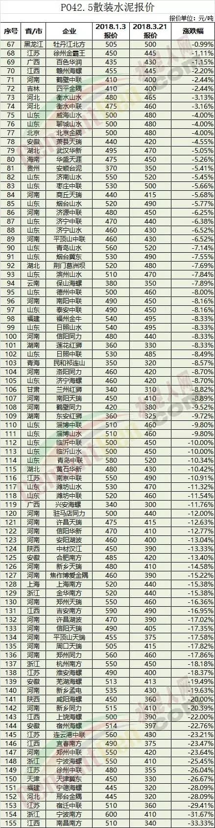 以上数据显示自本年度1月份以来,内蒙、辽宁、黑龙江、湖南、陕西、甘肃、新疆、广东、广西、云南、重庆、 河北、河南等省自治区水泥价格均有上调,上调幅度最高为45%以上。