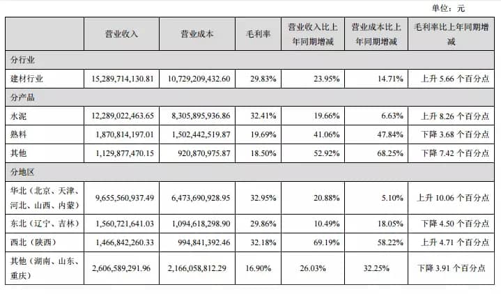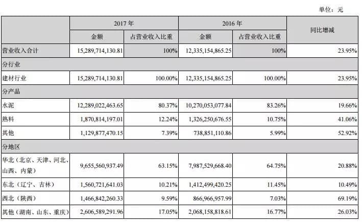 2017年,受益于“京津冀协同发展”国家战略的推进以及水泥行业“供给侧结构性改革”的积极影响,公司核心区域水泥市场秩序持续改善,水泥市场价格理性回归,水泥和熟料毛利率同比大幅提升;