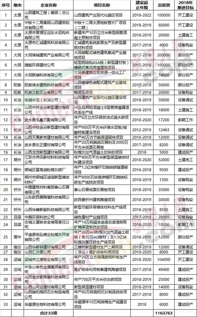 充分发挥重大项目建设对建材产业的投资带动作用,进一步推进山西省建材产业的供给侧结构性改革。推动大同瑞城建筑产业有限公司的装配式绿色建筑集成产业基地、山西建筑工程(集团)总公司建筑产业现代化园区等项目建设,推进建材装配式产业发展;推动运城市立港板业有限公司年产20万立方高强度秸秆板生产线、中国建筑材料集团泰山石膏有限公司泰山纸面石膏板等项目建设,促进建材产业绿色发展;推动中条山有色金属集团有限公司尾矿综合利用制备建筑陶瓷、武乡县泓晨万聚有限公司年产6万立方环保自洁式透水砖等项目建设,推进新型建材产品产业化。