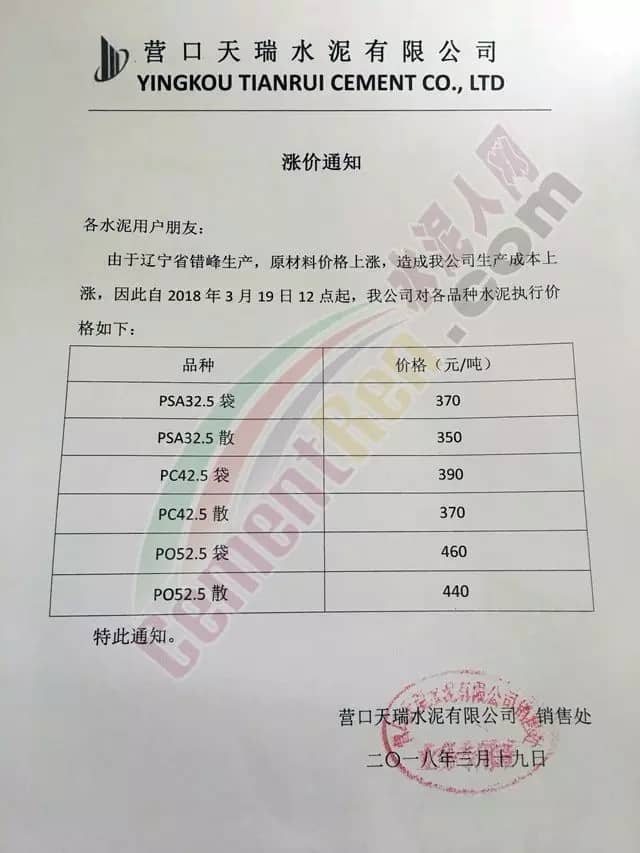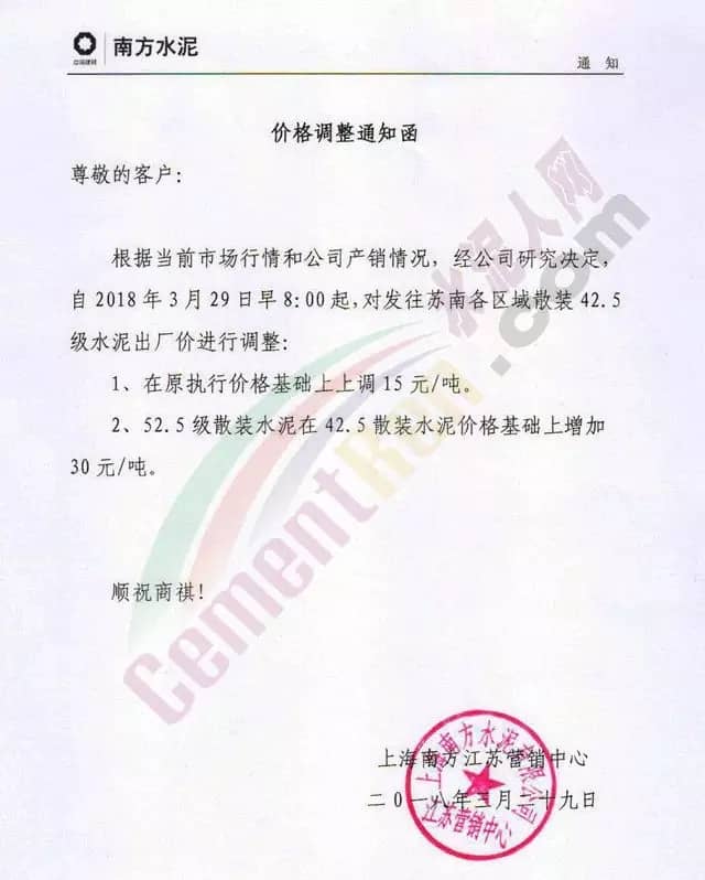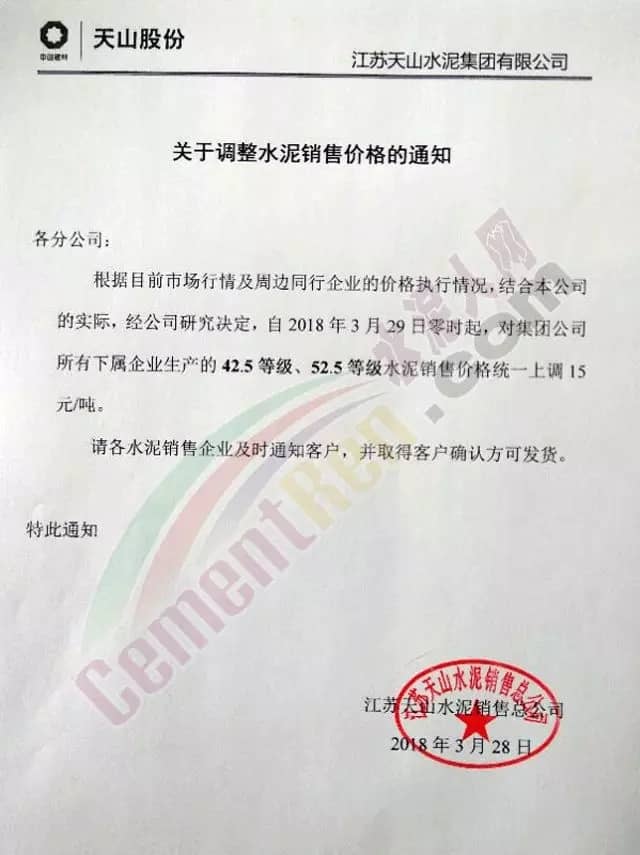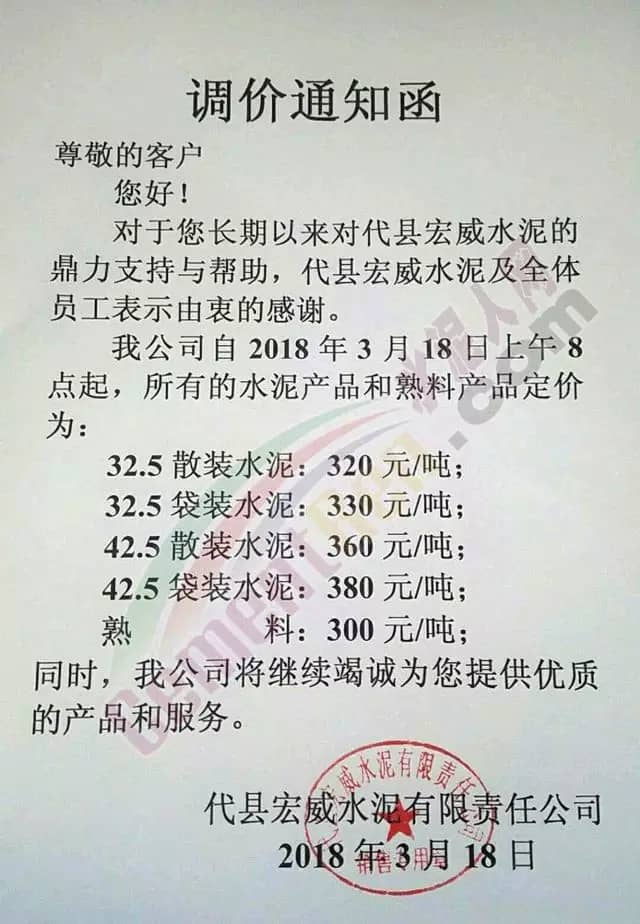 经公司研究决定,自2018年3月28日零时起,所有散装水泥在现有结算价基础上,上调10元/吨。
