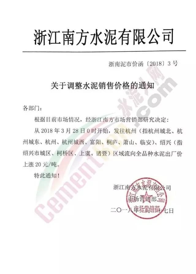 依照《水泥购销合同》约定,根据市场需求,经我公司研究决定:自2018年3月28日零时起,蕉岭分公司(万吨线)散装水泥在原有结算基础上上调10元/吨。不便之处,敬请支持。