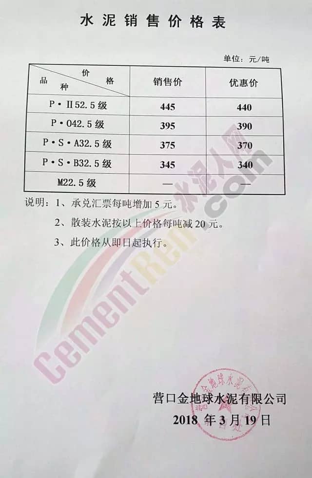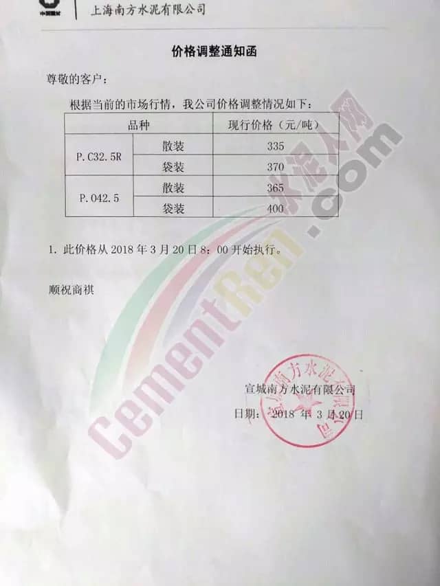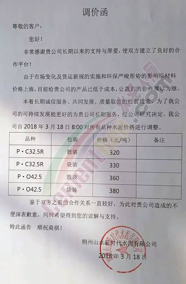 根据市场形势变化,我公司决定3月28日下午13:00对部分品种价格进行调整,425散上调10元/吨,325散价格上调15元/吨。给您造成不便敬请谅解。