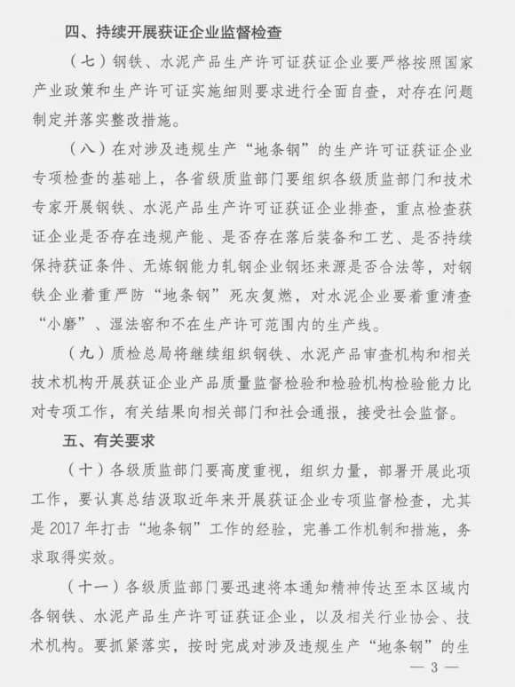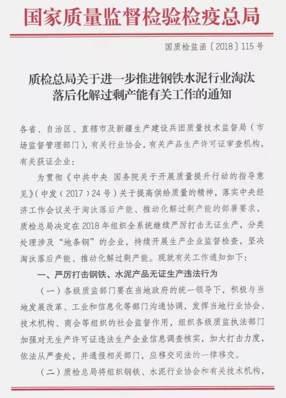 通知称,为贯彻《中共中央国务院关于开展质量提升行动的指导意见》(中发[2017]24号文)关于提高供给质量的精神,落实中央经济工作会议关于淘汰落后产能、推动化解过剩产能的部署要求,国家质检总局决定在2018年组织全系统对水泥生产许可证进行全面排查,继续严厉打击无证生产,持续开展生产企业监督检查工作。