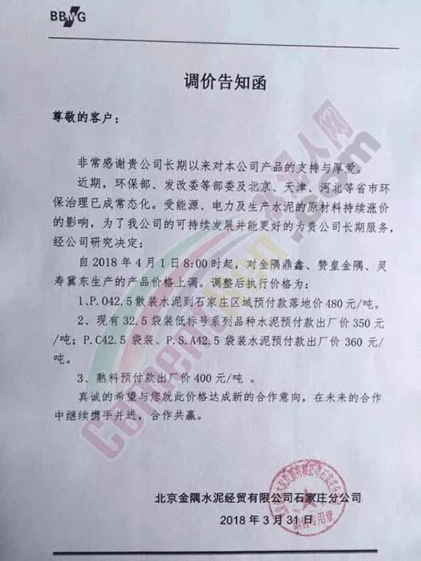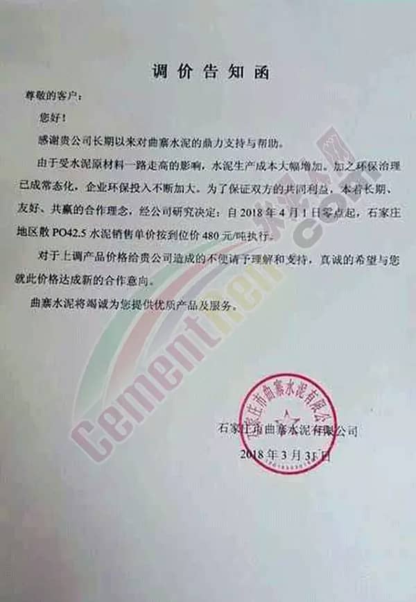 昨日,石家庄曲寨水泥也发布了提价通知,通知自2018年4月1日起石家庄地区散装PO42.5水泥销售单价按到位价480元/吨执行。