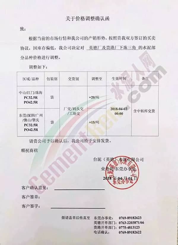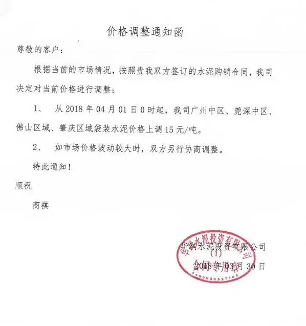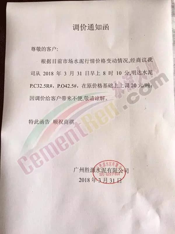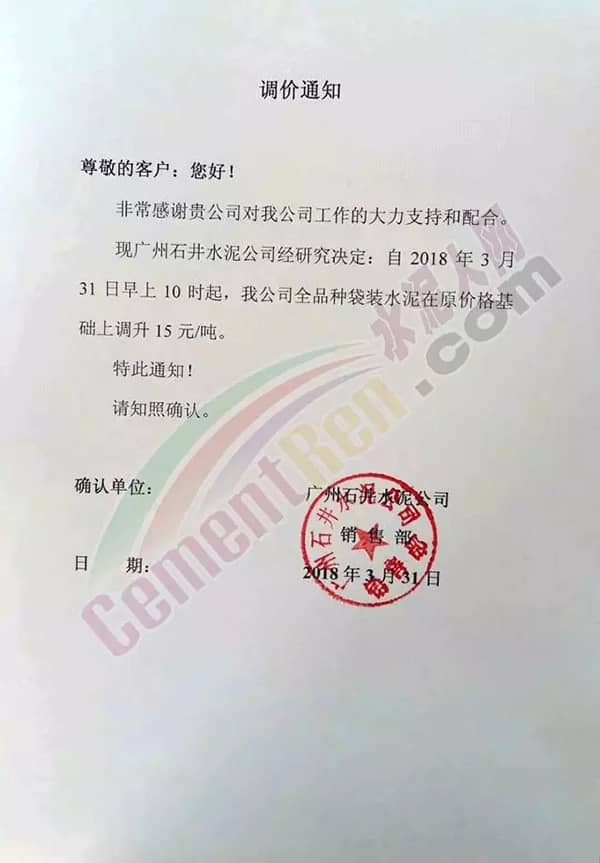根据当前市场形势及我司生产情况,我公司决定于2018年3月31日上午8:00上调各品种袋装、散装水泥20元/吨,价格上调以我司出厂过磅时间为准,如您继续安排提货,则视为认同此次价格调整。顺祝商祺!