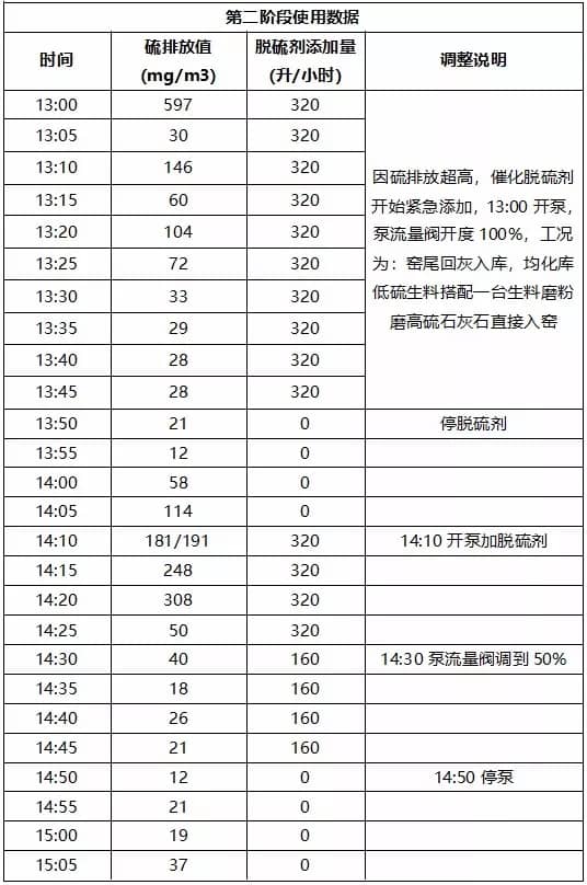 15:05后硫排放开始逐步上升,同时进入第三阶段使用,停止均化库低硫生料入窑,开启第二台生料磨,采用两台生料磨同时粉磨高硫石灰石直接入窑,以提高尾气硫排放。15:20硫排放达到199mg/m3并持续上升,为避免小时均值超标立即开始添加催化脱硫剂(因停止均化库生料出库,将原出库卸槽处脱硫剂添加点移至出磨生料斜槽直接入窑溜管上)。加剂后15:40排放值降至105mg/m3,随后稳定在75mg/m3左右。15:55降低催化脱硫剂添加量160L/h,硫排放逐步上升至120mg/m3左右,16:12降低催化脱硫剂添加量至64L/h,硫排放逐步上升至160mg/m3左右。16:30因生料磨产量高而造成入窑斗提头部返料,生料磨紧急停机一台,改为均化库低硫生料搭配一台磨高硫生料入窑以降低入窑斗提负荷。16:40停止催化脱硫剂添加,使用结束。