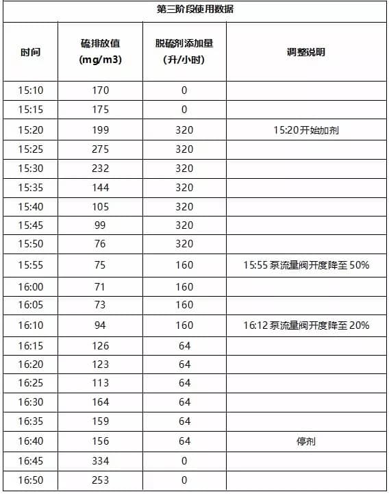 13:00时,尾气硫排放瞬时值达到597mg/m3,为避免硫排放小时均值超标,立即开启脱硫剂泵,按照320L/h开始脱硫剂的添加。添加后10分钟左右硫排放开始显著降低(数据如下表),12:30后硫排放稳定在30mg/m3以内,12:50停止脱硫剂添加。停剂后硫排放逐步上升,至14:10时硫排放达到191mg/m3,为控制小时均值,立即开始添加催化脱硫剂,但加剂后硫排放仍持续上升,14:20排放值达到308mg/m3,14:25硫排放降至50mg/m3以内。14:30因硫排放值低,降低催化脱硫剂添加量至160L/h,硫排放任持续稳定在低位,14:50停止催化脱硫剂添加,第二阶段使用结束。