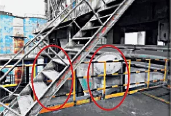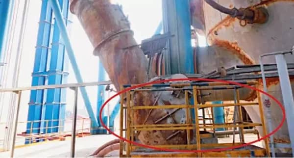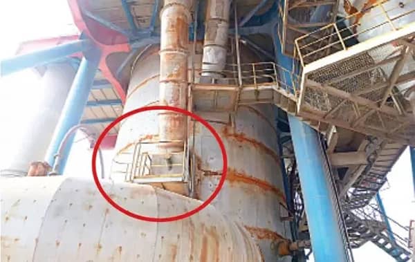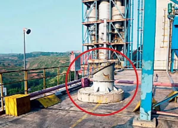 4 、水泥厂预热器系统下料管清堵孔处设置了平台,且直梯进入,平台狭窄无逃生通道。若出现热物料异常喷出,作业人员无法逃离,容易造成热物料的高温灼烫伤害。