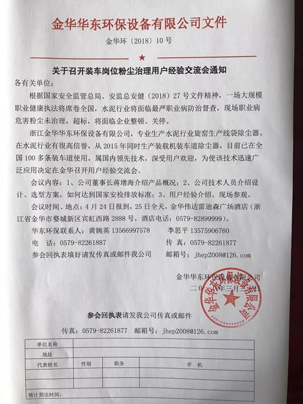浙江金华华东环保设备有限公司,专业生产水泥行业旋窑生产线袋除尘器,在水泥行业有很高信誉,2015年开始生产装载机装车道除尘器,目前 已在全国100多条装车道使用,属国内领先技术,深受用户欢迎,为使该 技术迅速广泛应用决定在金华召开用户经验交流会。