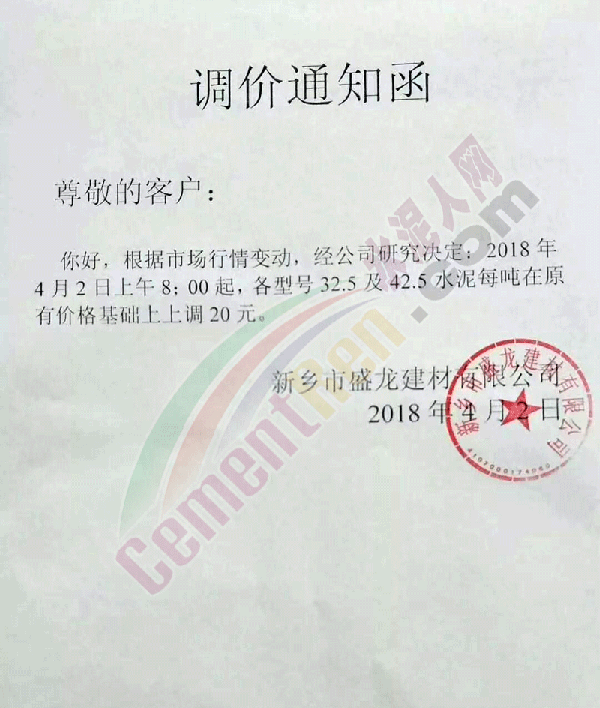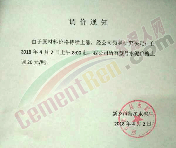 昨日,豫北新乡地区多家中小水泥企业纷纷发函通知上调水泥价格,通知称因原材料价格持续上涨,自2018年4月2日8:00起,各品种水泥价格在原价格基础上上调20元/吨。