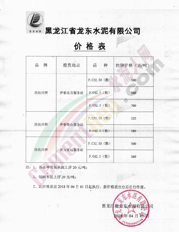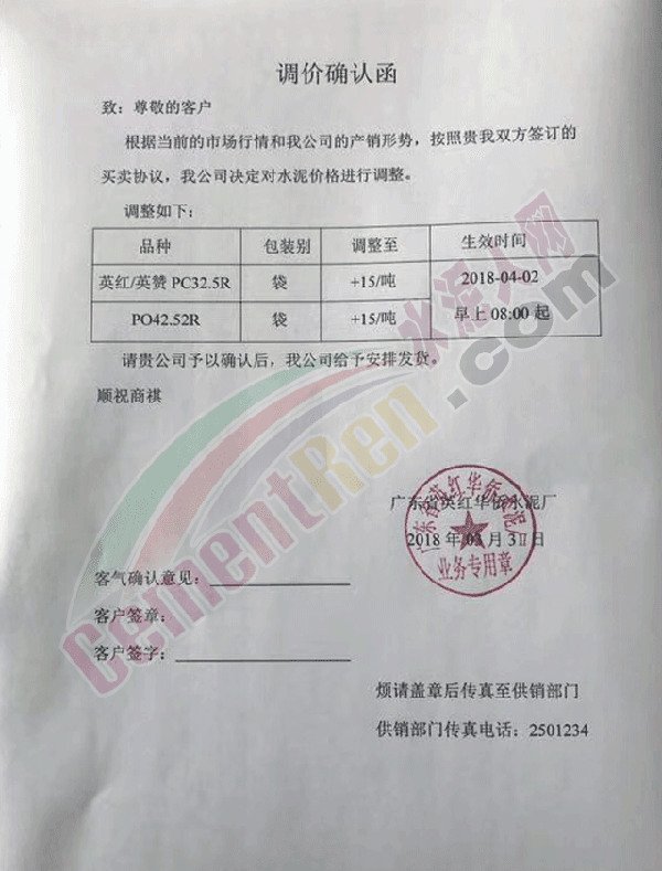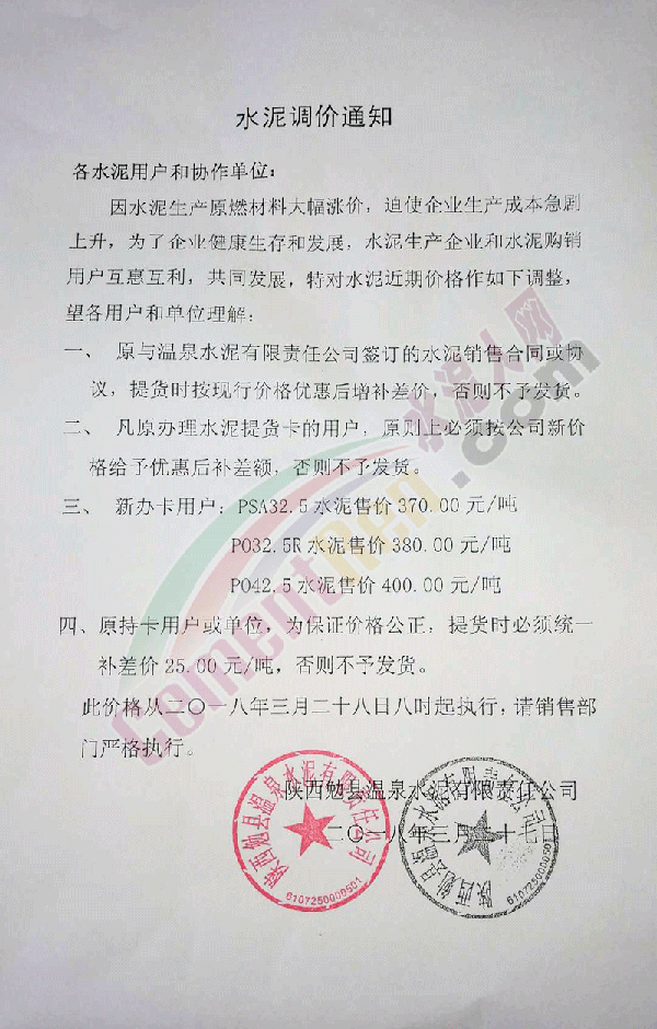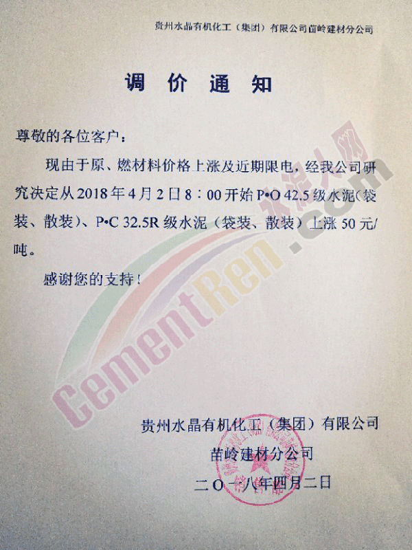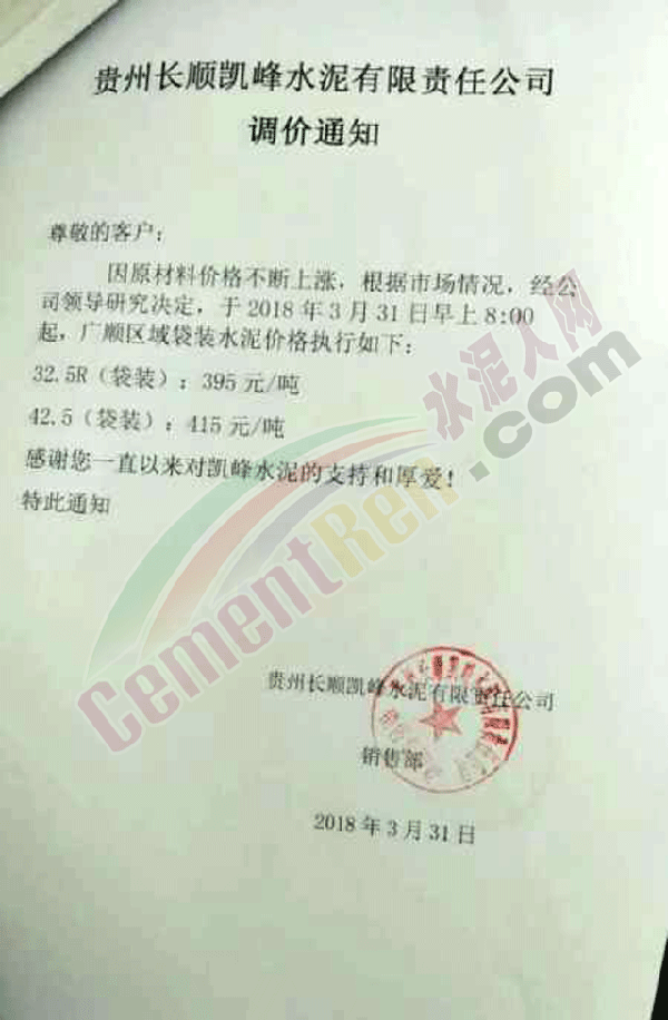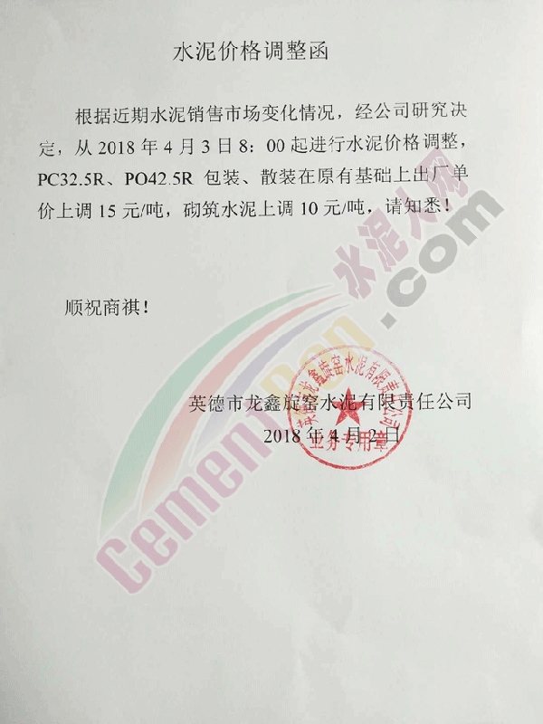 由于原材料价格持续上涨,经公司领导研究决定,自2018年4月2日早8:00起各品种水泥价格在原来价格基础上上调20元。