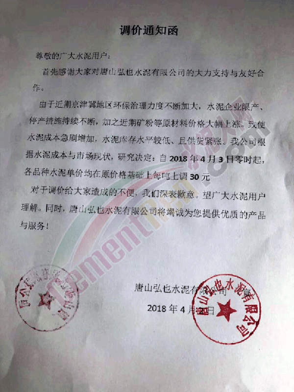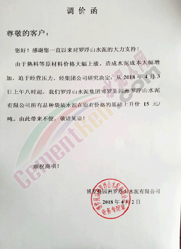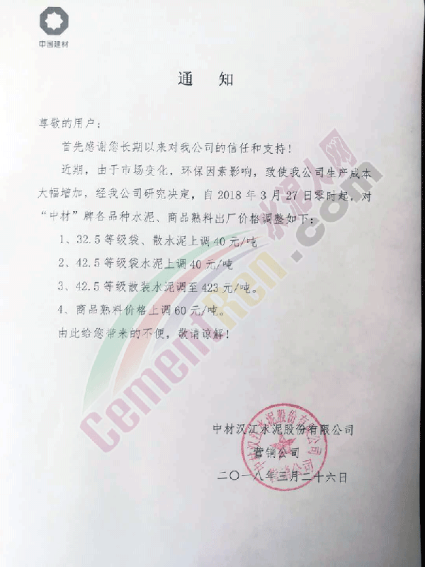 由于原材料价格持续上涨,经公司研究决定,自2018年4月2日早8:00起各品种水泥价格在原来价格基础上上调20元。