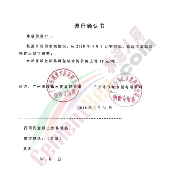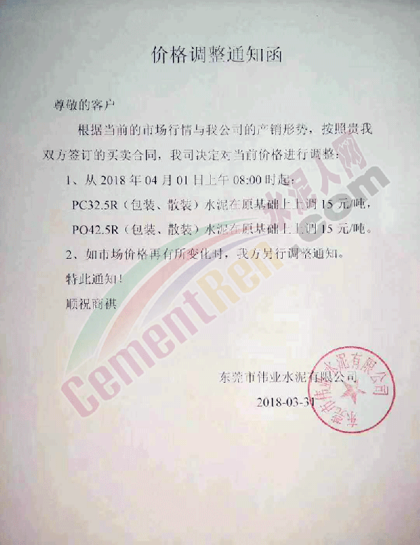 从2018年4月1日8时起,我司羊城牌各品种包装水泥上调15元/吨。