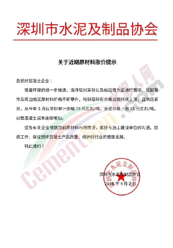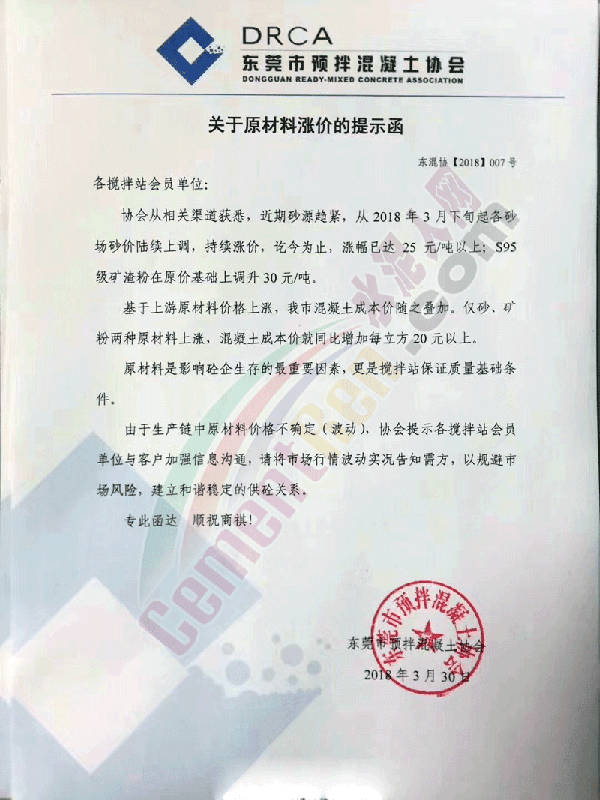 此前,东莞市预拌混凝土协会也有发布《关于原材料涨价的提示函》称协会从相关渠道获悉,近期砂源趋紧,从2018年3月下旬各砂场砂价陆续上调,涨幅已达25元/吨以上,S95级矿渣粉在原价基础上调30元/吨。基于上游原材料价格上涨,东莞市混凝土成本价随之叠加,仅砂、矿粉两种原材料上涨,混凝土成本价就同比增加每立方20元以上。
