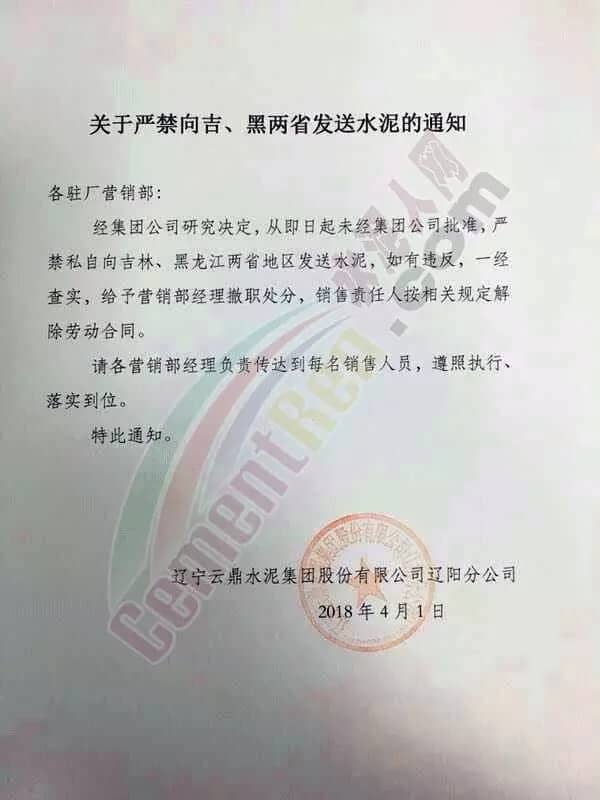 辽宁云鼎水泥集团股份有限公司辽阳分公司4月1日发布通知,严禁向吉林、黑龙江两省发送水泥。通知称,经集团公司研究决定,从即日起未经集团公司批准,严禁私自向吉林、黑龙江两省地区发送水泥,如有违反,一经查实,给予营销部经理撤职处分,销售责任人按相关规定解释劳动合同。