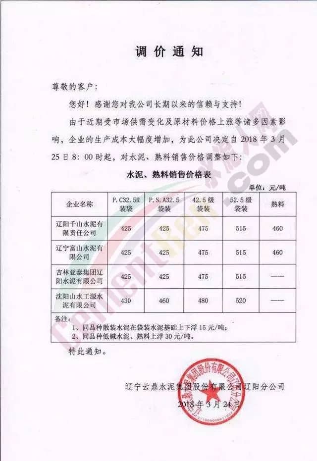 3月24日,辽宁云鼎水泥集团股份有限公司辽阳分公司发布调价通知称自2018年3月25日8点起对水泥熟料价格进行调整:具体执行价格如下。