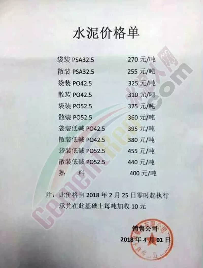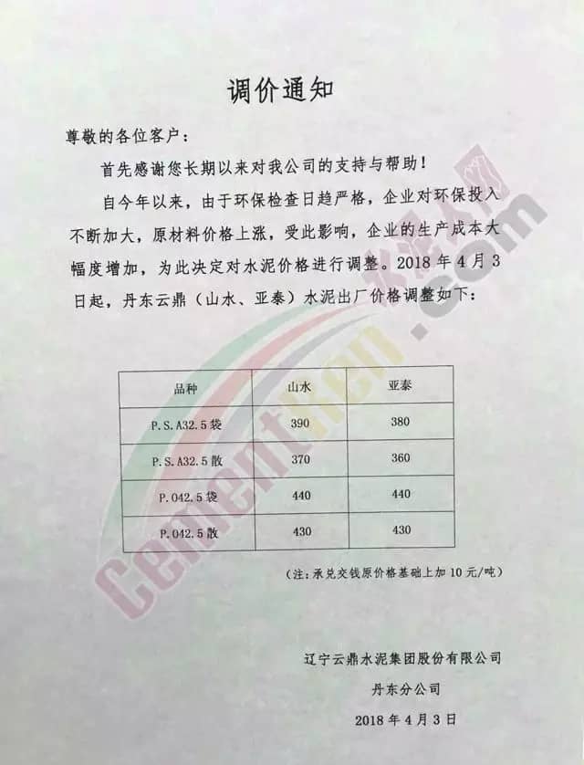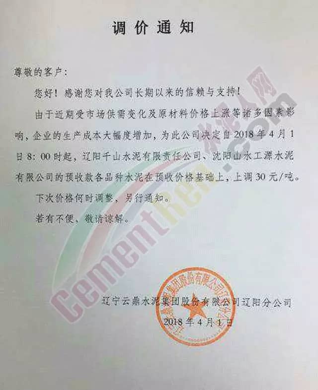 4月1日,辽宁云鼎集团股份有限公司沈阳分公司发布提价,由于近期市场供需变化,原材料价可靠上涨,企业的生产成本大幅增加,公司决定自2018年4月1日8点起,亚泰集团铁岭水泥有限、辽宁山水工源水泥有限公司、辽宁交通水泥有限公司、吉林亚泰集团(辽宁)建材有限公司沈北分公司、亚泰集团调兵山水泥有限公司的预付款、各品种水泥在预收价格基础上上调30元/吨。