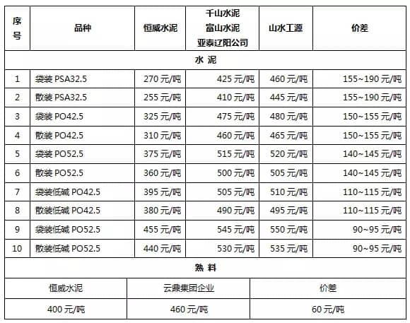 恒威水泥价格单